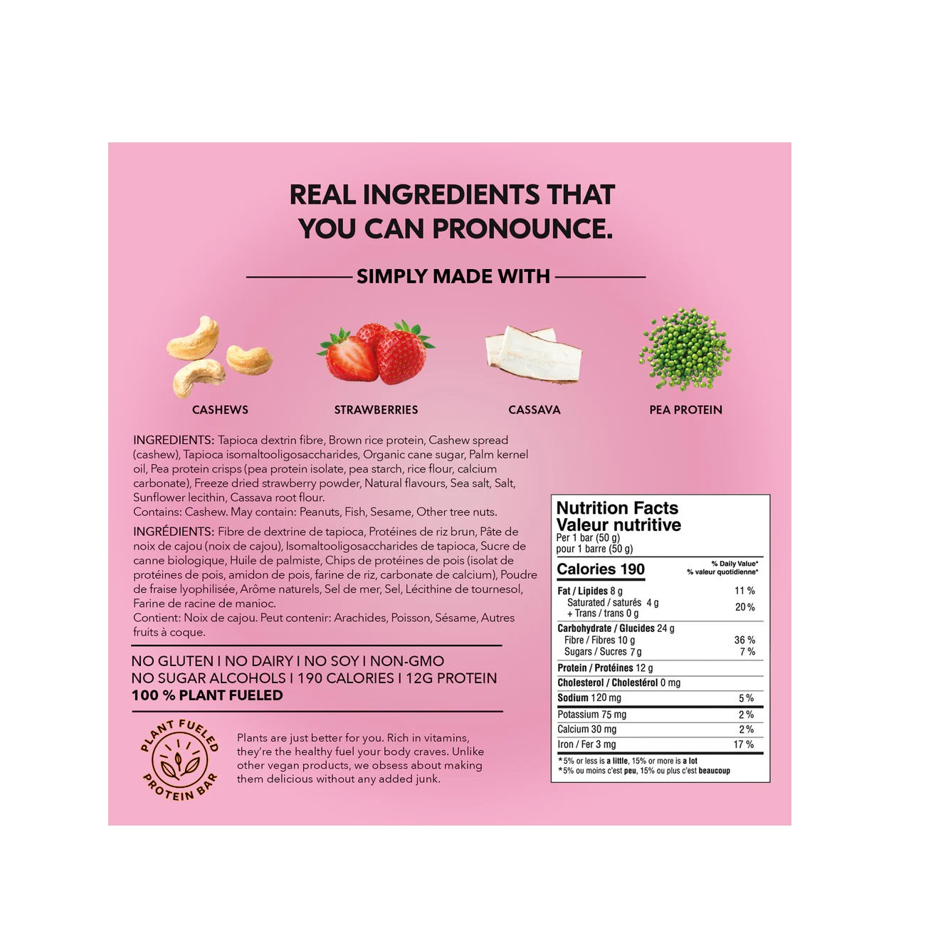 Ingredients: Tapioca dextrin fibre, Brown rice protein, Cashew spread (cashew), Tapioca isomaltooligosaccharides, Organic cane sugar, Palm kernel oil, Pea protein crisps (pea protein isolate, pea starch, rice flour, calcium carbonate), Freeze dried strawberry powder, Natural flavours, Sea salt, Salt, Sunflower lecithin, Cassava root flour.