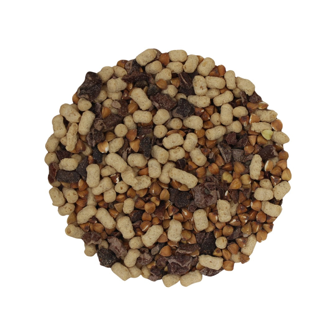 Organic buckwheat kasha, Pea protein crisps, Organic chia seed black, Organic cocoa nibs
