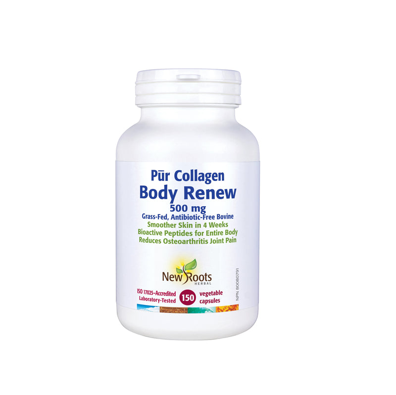 Not all collagen peptides are the same. Research has identified 28 different collagen types, and each type is comprised of homotrimers and heterotrimers that are formed by three polypeptide chains known as alpha chains, of which 40 types exist. The structural hallmark of all collagens is their triple helix. Different types of collagen contain differing protein and amino-acid composition. New Roots Herbal’s Pur Collagen Body Renew contains types I and III bioactive peptides from hydrolyzed collagen known as Verisol®, which have been clinically proven to benefit the health of hair, skin, and nails.