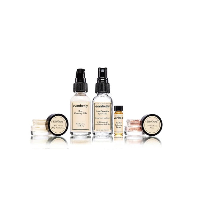 - Rose Cleansing Milk, Rose Geranium HydroSoul, Rosehip Treatment Facial Serum - Rose, Rose Vetiver Day Moisturizer, French Rose Clay