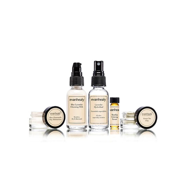- Blue Lavender Cleansing Milk, Lavender HydroSoul, Rosehip Treatment Facial Serum - Blue, Blue Chamomile Day Moisturizer, Green Tea Clay