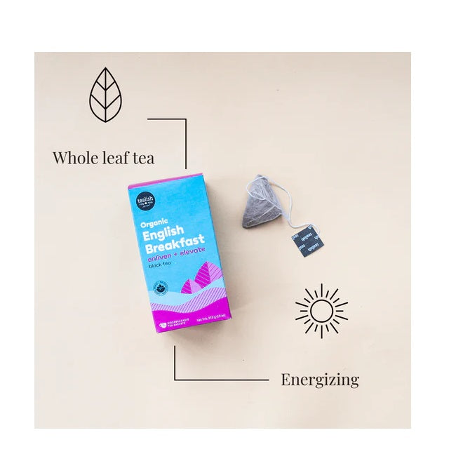 A simple breakfast tea with high quality black tea. Start the day with this bold and invigorating blend of organic black teas. Smooth enough to drink clear, and strong enough for a splash of milk. It's the perfect desk side helper for a focussed and productive day!