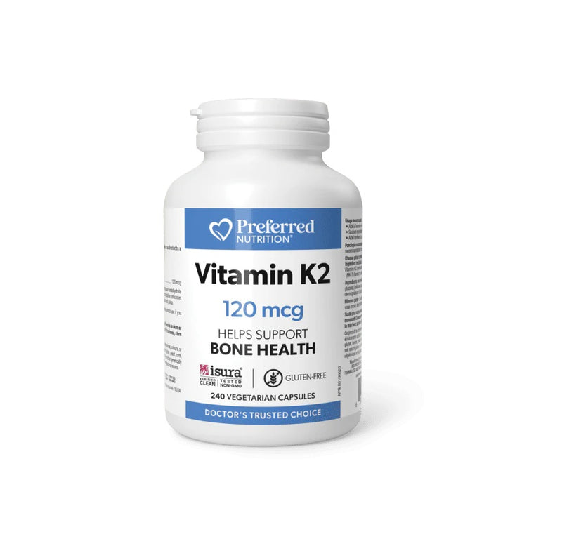Preferred Nutrition Vitamin K2 supports healthy bones with MK-7, the most bioavailable form of vitamin K2. Vitamin K2 plays a role in bone health by directing calcium toward bones and teeth, and away from arteries and soft tissue. Each vegetarian capsule provides 120 mcg of vitamin K2 as menaquinone (MK-7) from natto beans.