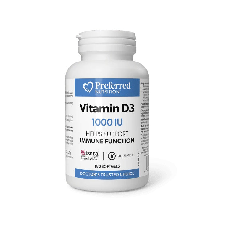 Preferred Nutrition Vitamin D3 1000 IU softgels help support immune function and build strong bones and teeth. Just one softgel per day provides 1000 IU of vitamin D3 in the preferred cholecalciferol form. These easy-to-swallow softgels are formulated with flaxseed oil for enhanced absorption to help prevent vitamin D deficiency.