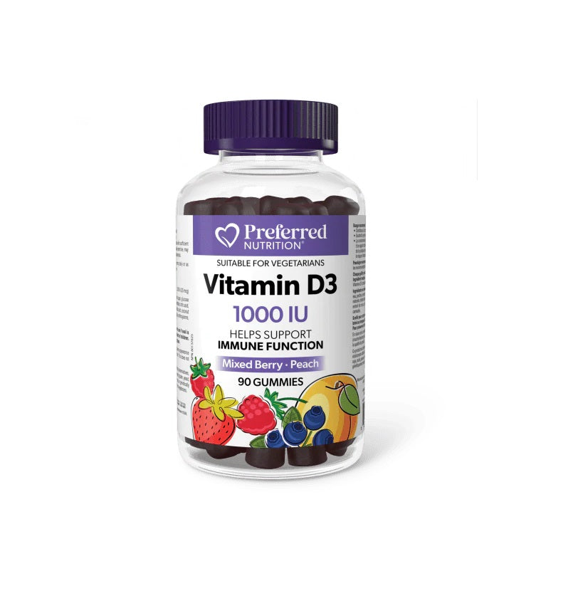 Preferred Nutrition Vitamin D3 1000 IU features vegetarian gummies to help support immune function and build strong bones and teeth. Just one gelatin-free gummy per day provides 1000 IU of vitamin D3 in the preferred cholecalciferol form. These delicious gummies flavoured in mixed berry and peach make it easy to help prevent vitamin D deficiency.